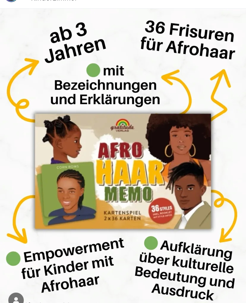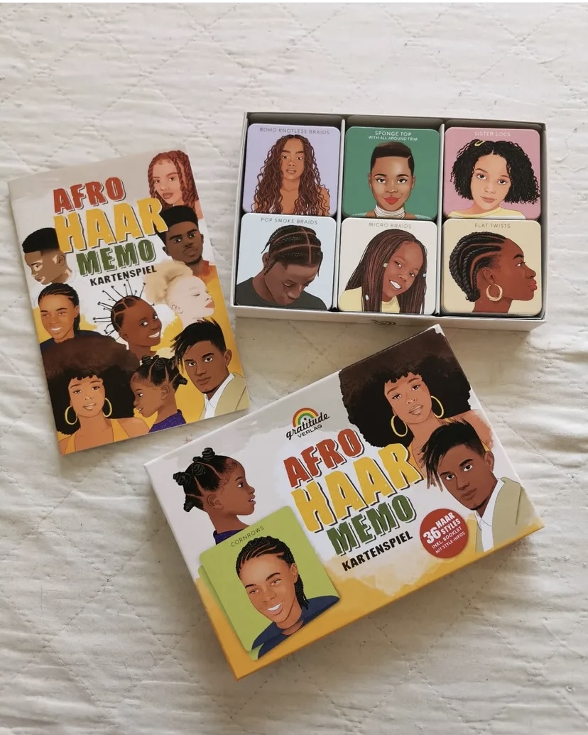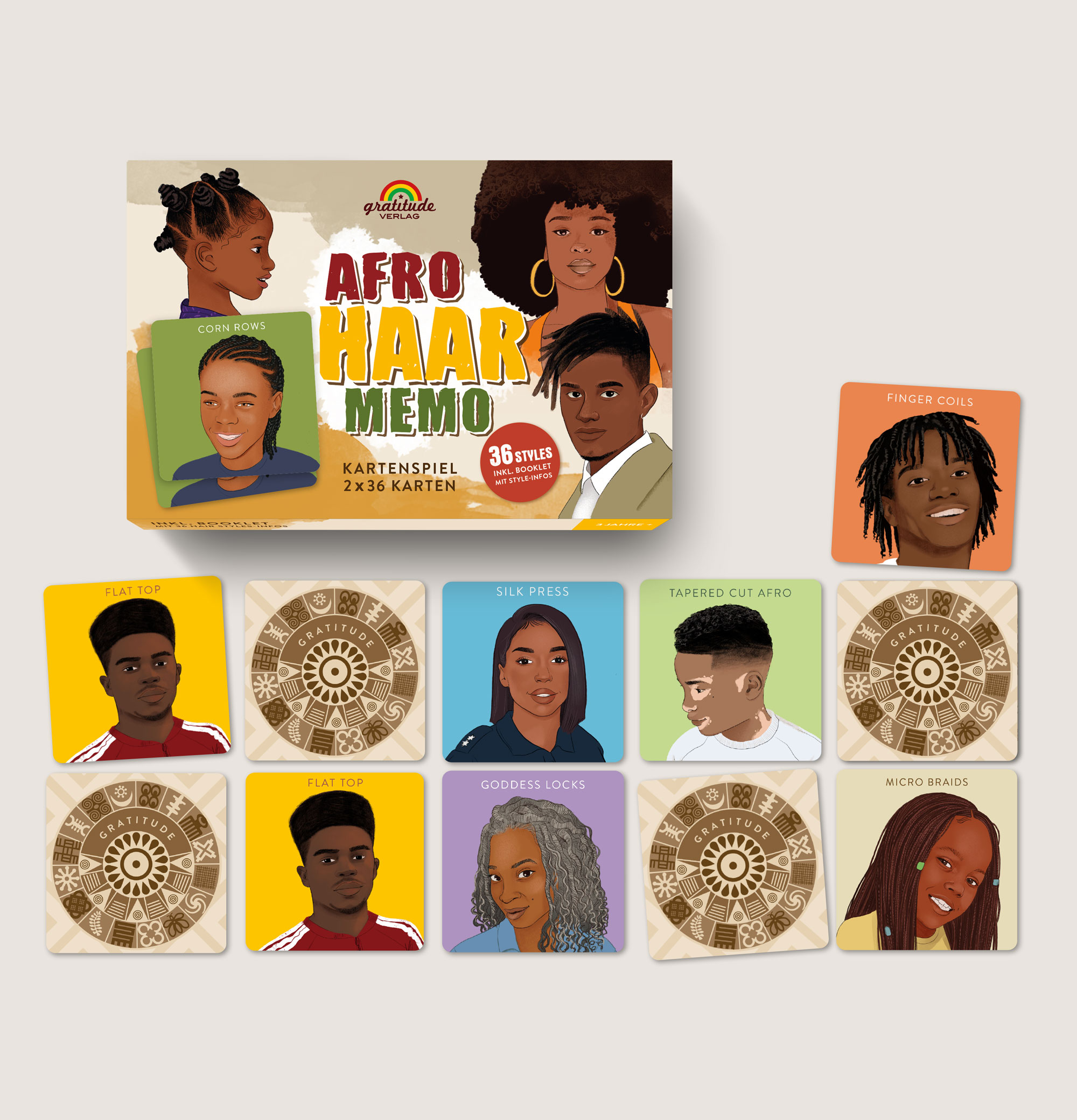 Entdecke das Afro-Haar-Memo-Spiel, das erste seiner Art in Deutschland! Dieses innovative Spiel lädt dazu ein, die faszinierende Welt afrozentrierter Frisuren spielerisch zu erkunden. Es ergänzt perfekt die Kinderbücher „Wenn meine Haare sprechen könnten“ und „Freedom Braids“ aus dem Gratitude Verlag.