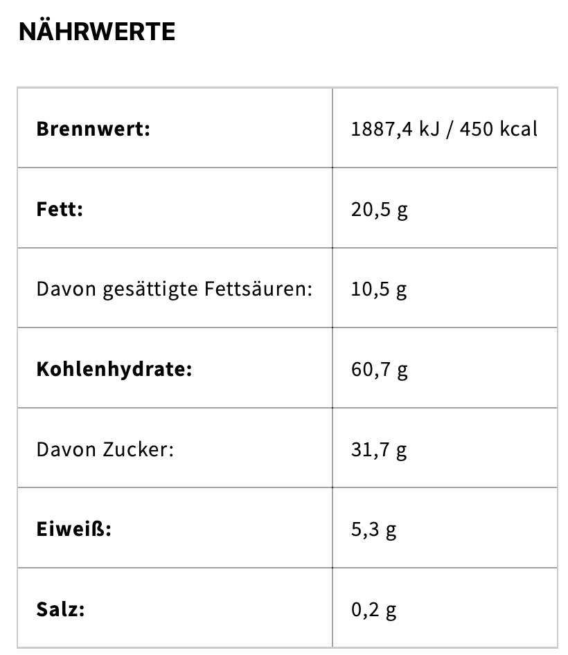 Allergene: Enthält glutenhaltiges Getreide, Eier- und Milcherzeugnisse. Kann Spuren von Schalenfrüchten, Mandeln, Soja und weiteren Milchbestandteilen enthalten.