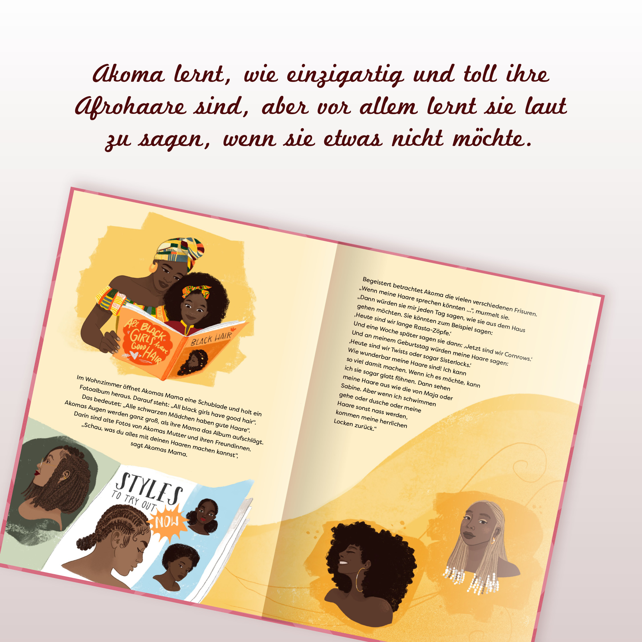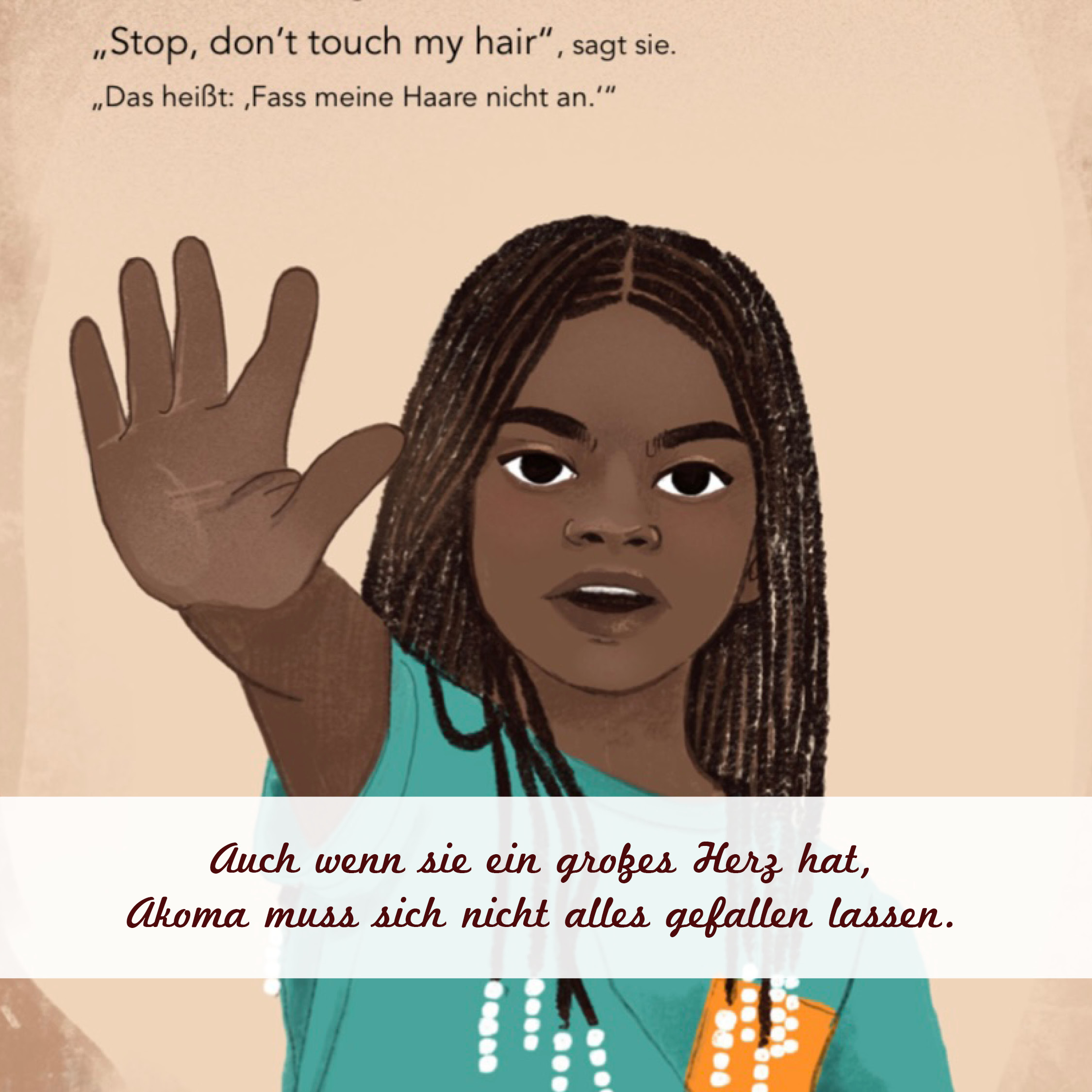 The 7-year-old Akoma lives with her parents in a small town near Hamburg. In Twi, a language spoken in Ghana, Akoma means „heart.“ Often, Akoma’s father tells her, „With your Akoma, the world is open to you.“ However, Akoma’s big heart reaches its limits when strangers touch her hair without asking.